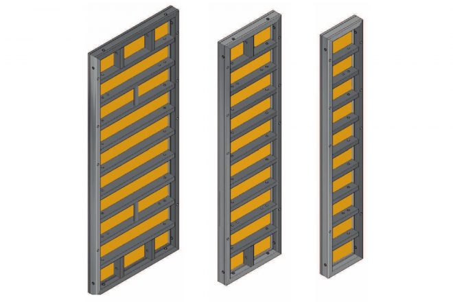 Застосовуються для прямолінійних ділянок об’єкта і ділянок, що утворюють зовнішній прямий кут. Отвори для установки анкерних стержнів і торцеві отвори для транспортування щитів розташовані на контурному профілі каркаса. Отвори для кріплення підкосів і підмостей розташовані на внутрішньому профілі і підсилювачах каркаса. Ребра жорсткості (внутрішній профіль) каркаса щита розташовані з кроком 300 мм. Параметри стандартних щитів вказані в таблиці. За бажанням замовника можуть бути виготовлені будь-які нестандартні щити проміжних розмірів шириною, кратною 0,05 м.