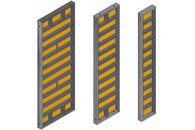 Застосовуються для прямолінійних ділянок об’єкта і ділянок, що утворюють зовнішній прямий кут. Отвори для установки анкерних стержнів і торцеві отвори для транспортування щитів розташовані на контурному профілі каркаса. Отвори для кріплення підкосів і підмостей розташовані на внутрішньому профілі і підсилювачах каркаса. Ребра жорсткості (внутрішній профіль) каркаса щита розташовані з кроком 330 мм. Параметри стандартних щитів вказані в таблиці. За бажанням замовника можуть бути виготовлені будь-які нестандартні щити проміжних розмірів шириною, кратною 0,05 м.